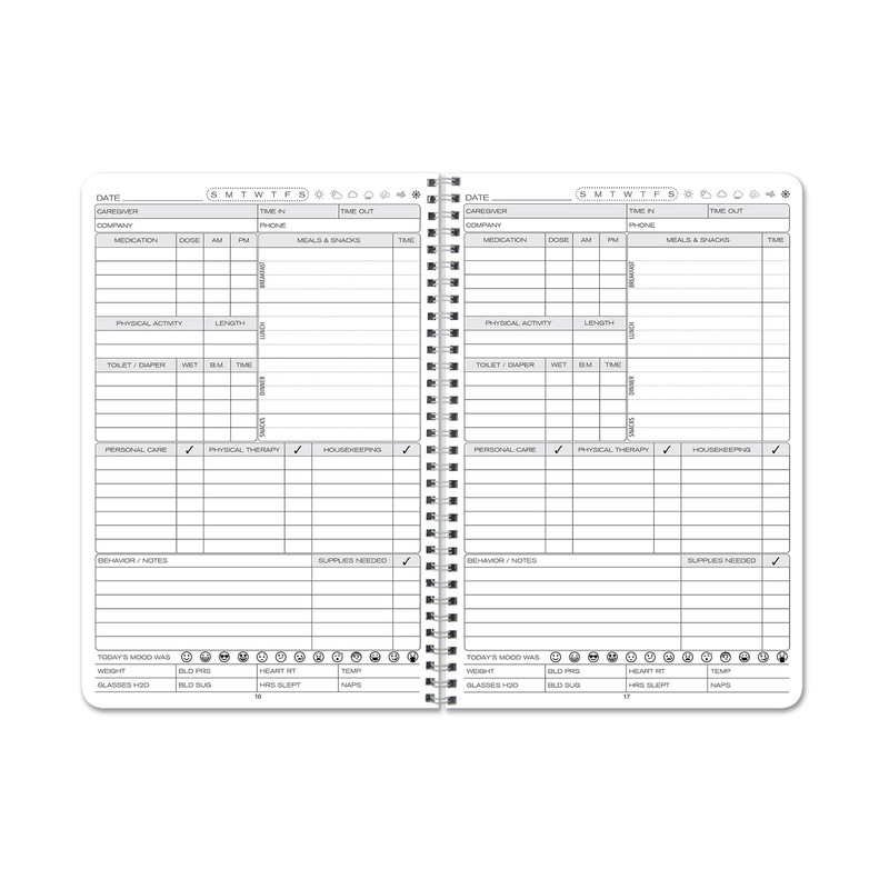 - Daily, there are pages to log who is the caregiver that day (if they rotate), medication doses and times given, physical activity, bowel movements, personal and physical care, housekeeping, meals, behavior, supplies needed, and other important notes