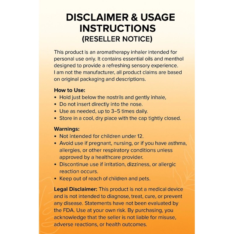 This product is an aromatherapy inhaler intended for personal use only. It contains essential oils and menthol designed to provide a refreshing sensory experience. I am not the manufacturer; all product claims are based on original packaging and descriptions.