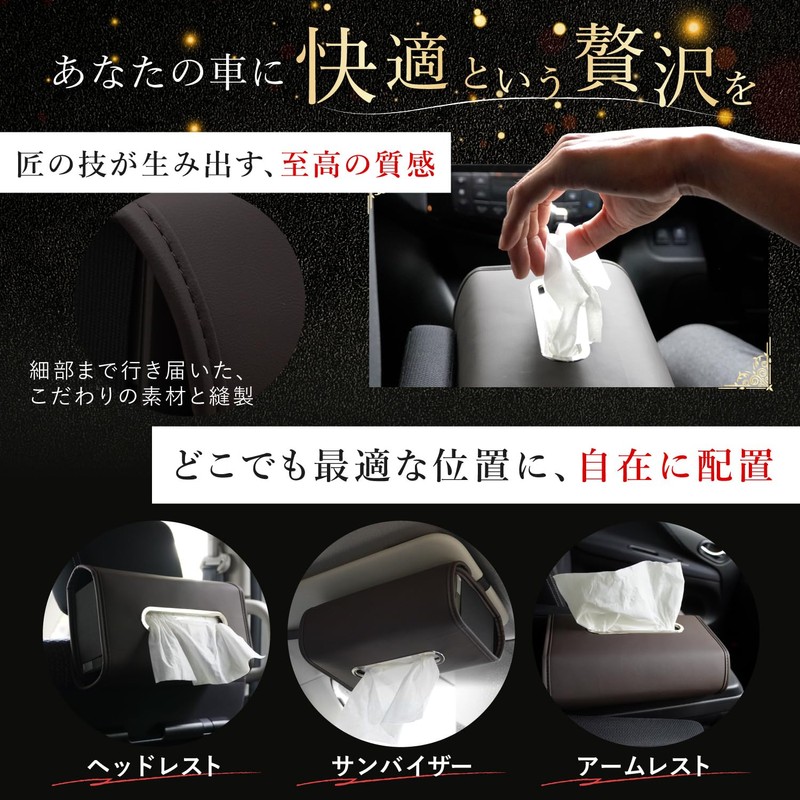 - 4 Multi-Position Mounting: Can be installed in 4 locations including headrests, armrests, headrests, and sun visors. High quality strap and velcro for stability during sudden braking. You can use the tissue in any position comfortably