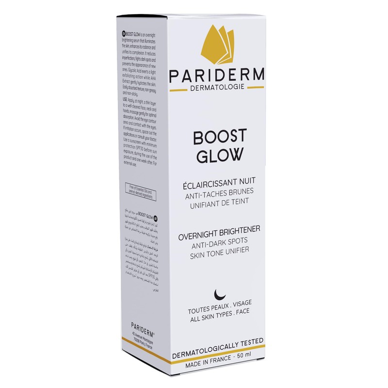 - Boost Glow ist ein aufhellendes Nacht-Serum, das die Haut aufhellt, ihren Glanz verbessert und den Teint vereinheitlicht