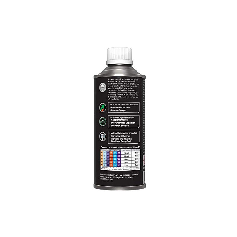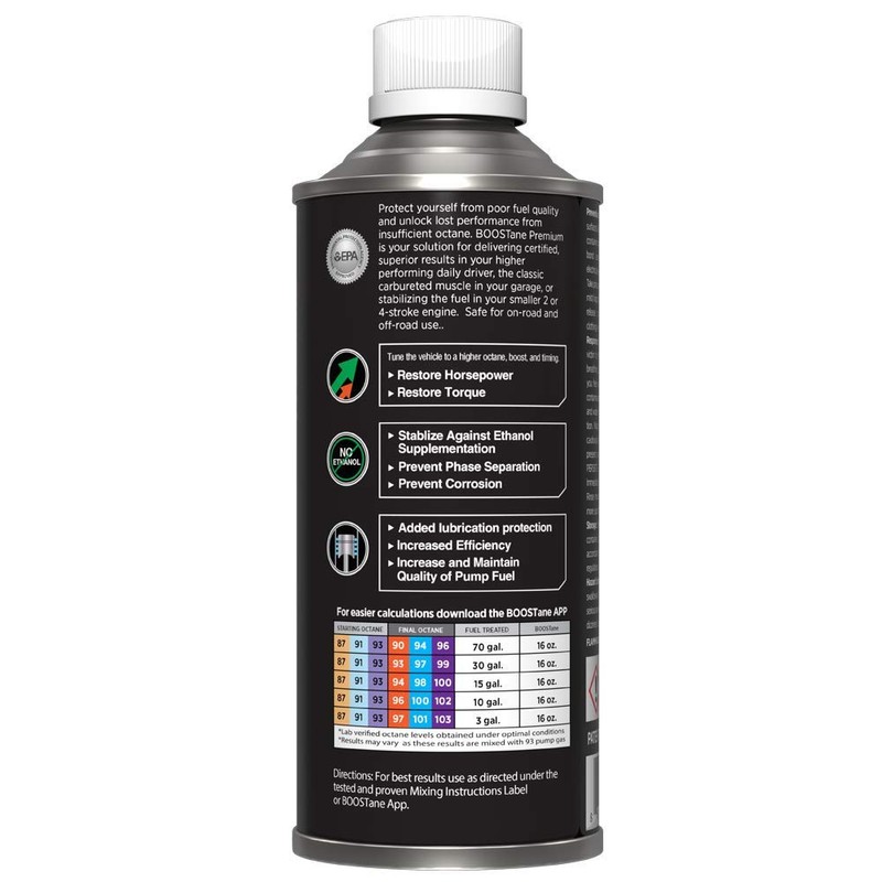 BOOSTane Premium Octane Booster is formulated to increase octane levels up to 100. Our BOOSTane Premium line is meant for lower compression and two-stroke engines, this is a street-legal product designed for non-racing vehicles where higher-octane fuel is not available.