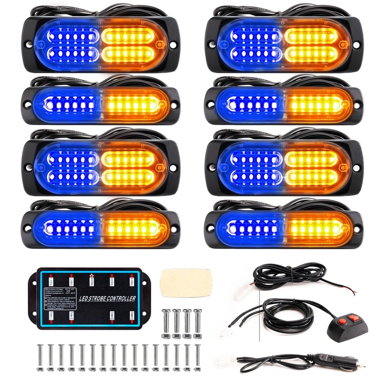 BooYu 8-pcs Sync Feature LED Emergency Strobe Lights Ultra Slim Grille Surface Mount Flashing Warning Hazard Light Bar w/Controller for Construction, Firefighter, Trucks, Vehicles, Car (Amber/Blue)