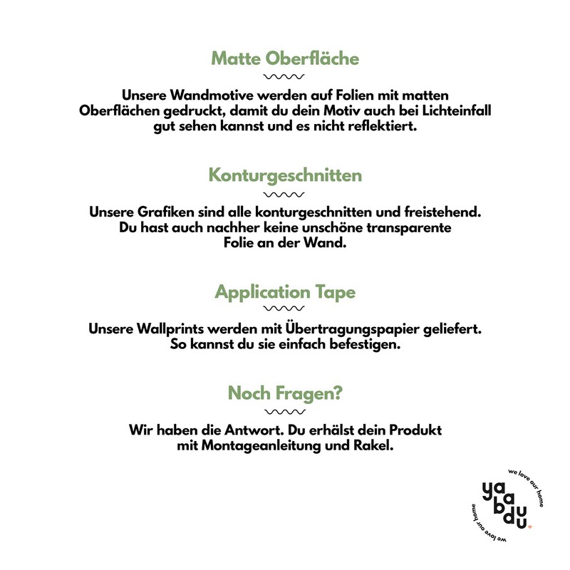 Die Anbringung des Wandtattoos funktioniert einfach und intuitiv. Damit ganz sicher nichts schief geht, versenden wir mit dem Dekor eine ausführliche Montageanleitung, die alle Schritte genau erklärt. In der Bestellung ist zudem ein Rakel enthalten, mit dem sie das Dekor blasenfrei anbringen können. Auch die Entfernung ist kein Problem. Der Wandaufkleber lässt sich ohne Rückstände ablösen.