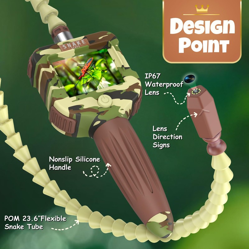 - 5 Year Old Boy Gift Design Feature: Inspired by the playful green camouflage colors of adventure. Flexible 23.6'' snake tube is made by premium POM material, smooth surface, bends and moves easily, kids can explore hard-to-reach areas like rocks, tree bark or even underwater. Nonslip silicone handle and lens direction signs make kids toys easy to use.