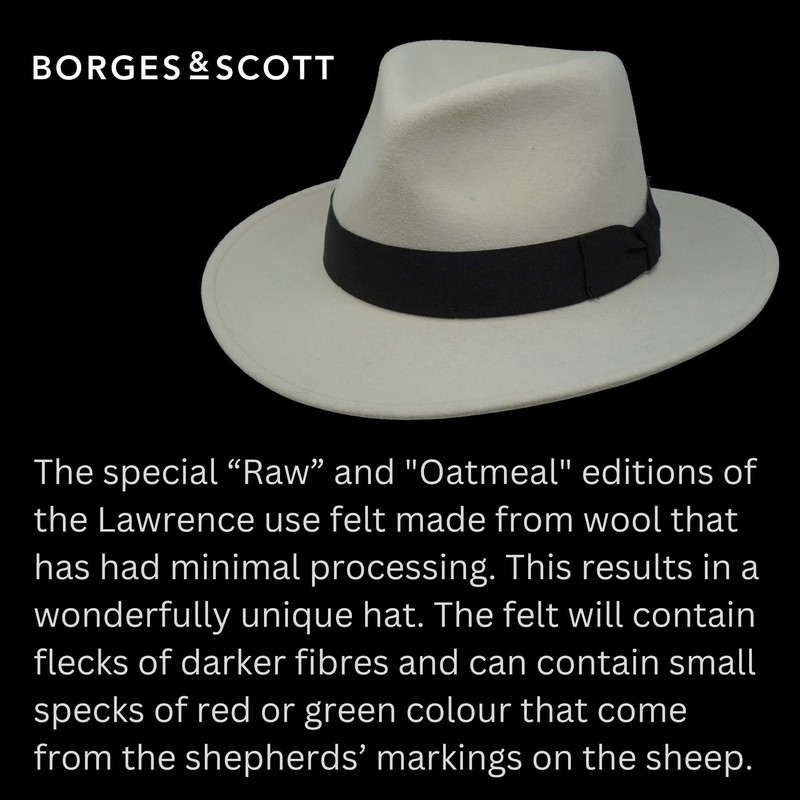 Raw Felt: Please note the “Raw” and “Oatmeal” colours use felt made from wool that has had minimal processing. This results in a wonderfully unique hat. The felt will contain flecks of darker fibres and can contain small specks of red or green colour that come from the shepherds’ markings on the sheep.