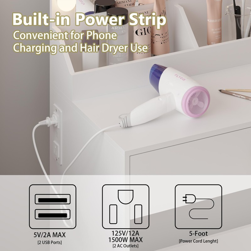 - Built-in Power Outlets and USB Ports - Stay connected while getting ready with the integrated charging station, featuring two AC outlets and two USB ports. Conveniently use hair tools, charge your phone, or power beauty devices without leaving your seat