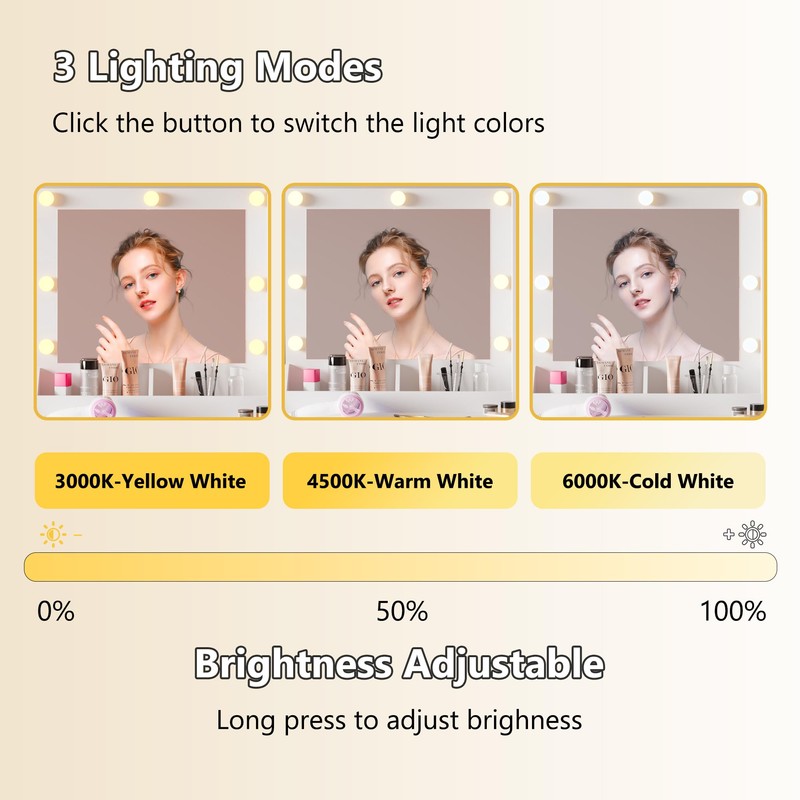 - Vanity Desk with Adjustable Lighting – BORNOON small makeup vanity desk features a large mirror surrounded by seven LED bulbs, offering three lighting modes: warm white, natural white, and cool white. With adjustable brightness, you can create the perfect lighting for makeup, live streaming, or salon use