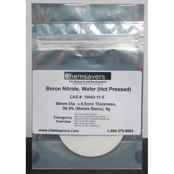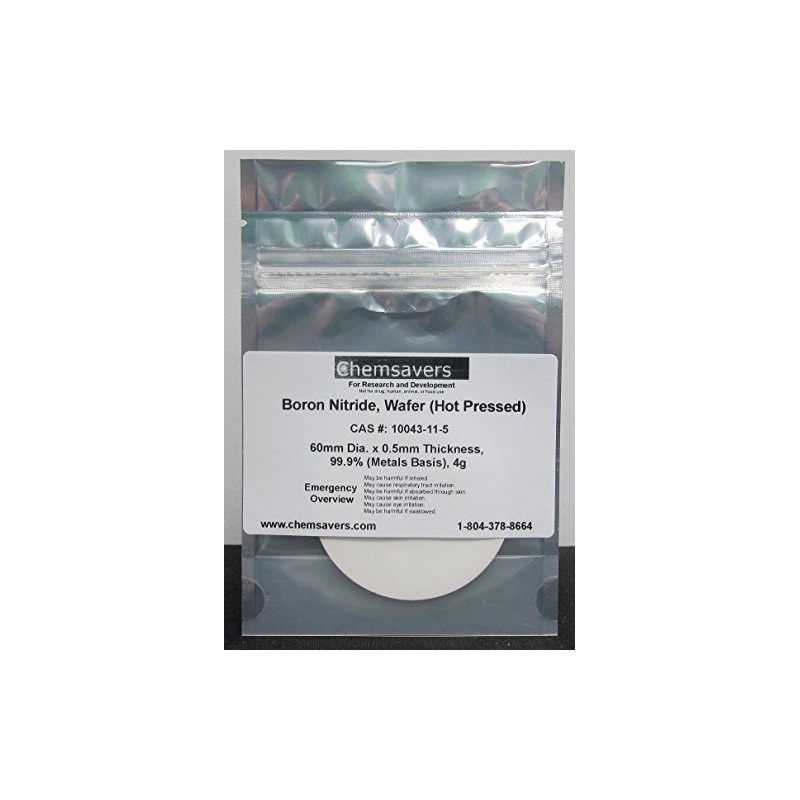Boron Nitride, Wafer (Hot Pressed), 60mm Dia. x 0.5mm Thickness, 99.9% (Metals Basis), 4g For Research & Development Not for drug, human, animal, or food use Certificate of Analysis: Appearance (Color) White; may contain small off colored specs Appearance (Form) Wafer Assay (Metals Basis) 99.9% Diameter 60mm Thickness 0.5mm Condition Hot pressed CAS: 10043-11-5 FORMULA: BN
