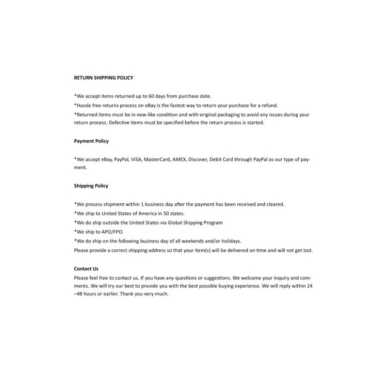 | Standard Shipping (US to US by Item) | 5–10 business days | $6.50 for the first item, $2.00 each additional |