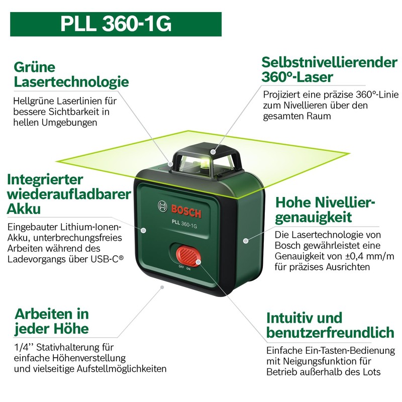 • Items included: PLL 360-1G, softbag, 1 x Li-ion battery, USB-C cable, user manual, carton
