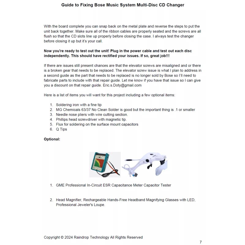 The lack of good, honest techs who can do good and reasonably priced restoration/rebuild of audio equipment made me start offering this restoration kit. Also, the fact that shipping your Bose Wave CD Changer back and forth is a recipe for disaster. These units are over 20 years old and if not packed properly they can easily be broken. Not to mention having to spend $20-$30 each way to ship and $140-300 to get it fixed.