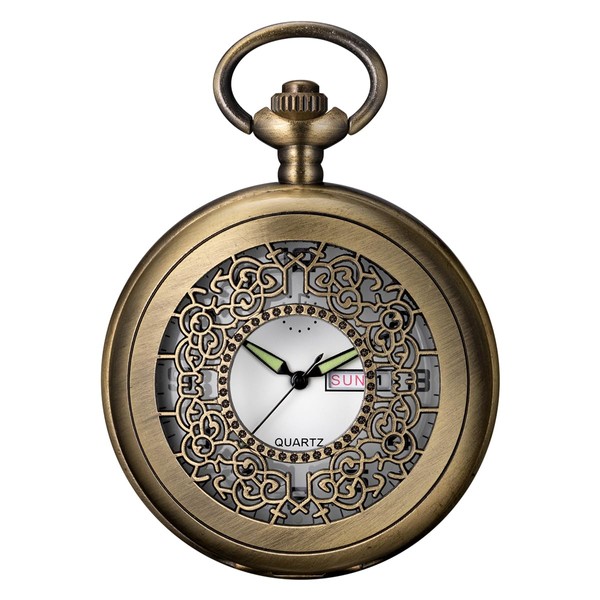 - 【Classic Pocket Watch】Hollow carved bronze case, White dial with luminous hour, minute, and second hands, date window at 3 o'clock, full arabic numerals scale easy to read, make the watch more functional. Can be worn with any outfit, whether it is a suit or a casual suit, it is very versatile.