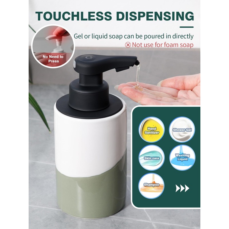 Bosilunlife Automatic Liquid Soap Dispenser Bathroom, Ceramic Soap Dispenser Touchless for Bathroom or Kitchen, Suit for Hand Soap, Shampoo, Shower Gel, Green & White