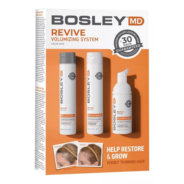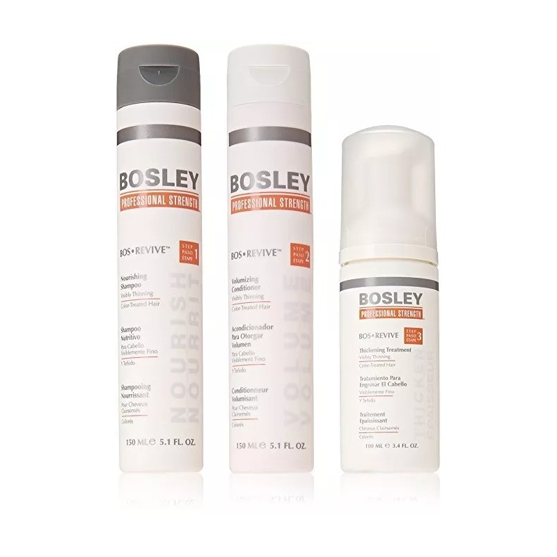 Bosley capacidad profesional BosRevive para Cabellos Teñidos 3-Paso Sistema Starter Kit (BosRevive Champú Nutritivo para Cabellos Teñidos 5.1, BosRevive Acondicionador Volumen de Cabellos Teñidos 5.1 y BosRevive Tratamiento sin enjuague para el cabello teñidos 3.4) es la fórmula para los que tienen "adelgazamiento del cabello y visiblemente pérdida excesiva del cabello" para rejuvenecer y acondicionar el cabello y el cuero cabelludo miniaturizado frágil.
