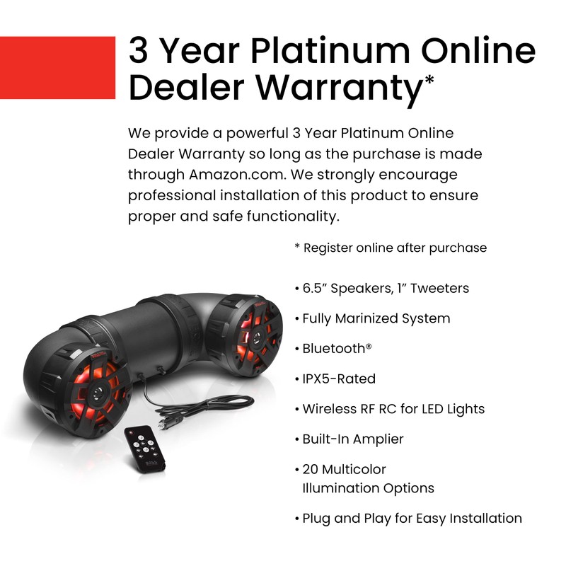 - BOSS Audio Systems provides a powerful 3-year Platinum Online Dealer Warranty so long as the purchase is made through Amazon.com. We strongly encourage professional installation of this product to ensure proper and safe functionality