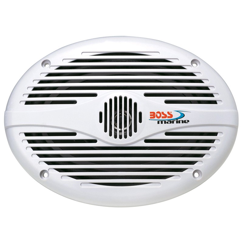 Optimized for use with water craft, this this Boss Audio MR690 two-way, 6 x 9-inch speaker in white will keep the boat rocking. Featuring a 6 x 9 inch oblong design, these speakers offer an 80-ounce magnet structure, poly injection cone material for durability in extreme temperature variations, 1-inch aluminum voice coil, and 1-inch mylar dome tweeter for clear highs and maximum peak power handling. They can handle up to 350 watts of peak power, and they come with a durable white plastic cover.