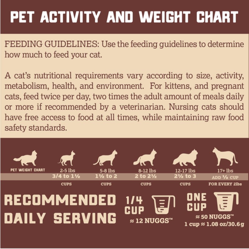 - Feeding Guidelines: Adult cats- Split the total daily serving into 2 feedings per day. Kitten and pregnant females- Feed two times the adult amount twice per day. Nursing cats- Should always have free access to food, while maintaining raw food safety standards. The feeding guidance is approximate, as every pet has different metabolic requirements based on their breed, overall health, and activity level.
