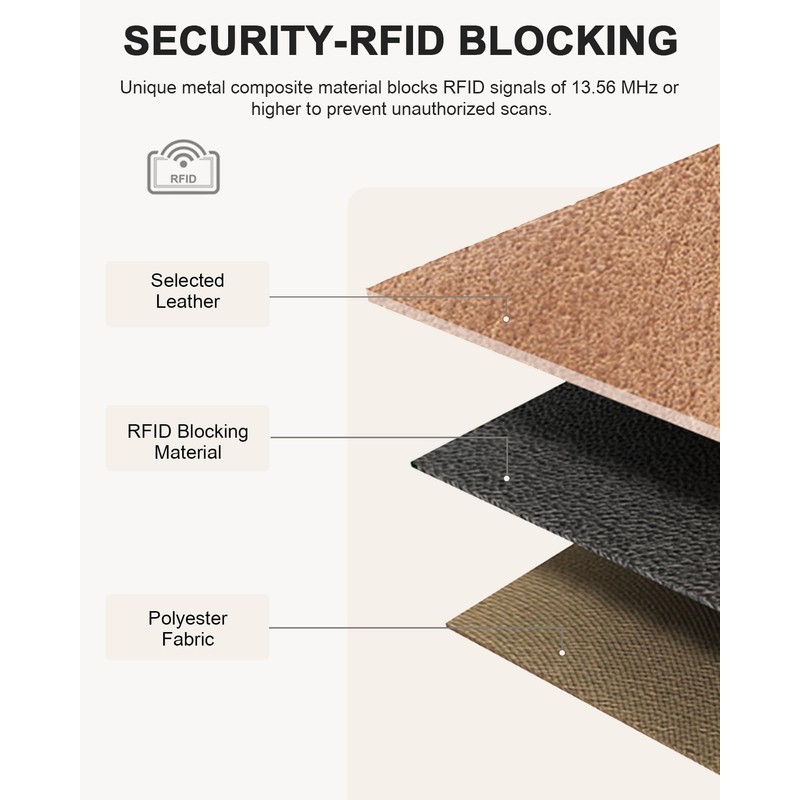 - RFID Shielding & Protection The leather mini wallet features proprietary shielding material that blocks all RFID signals and protects your valuable private information from unauthorized remote access, so that your personal information and credit card details are safe when traveling or shopping.