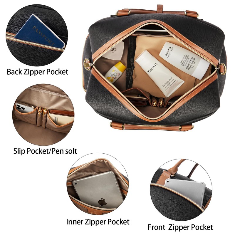 - 【High Quality Matrial】This weekender bag is made of handmade by professional craftsman with high quality water-resistant pu leather, soft khaki fabric lining,and vintage bronze hardware.Well-knit stitch make it bear heavier weight stuff without tearing.Classic color combination make it stylish,also easy to match any outfits and occasion.