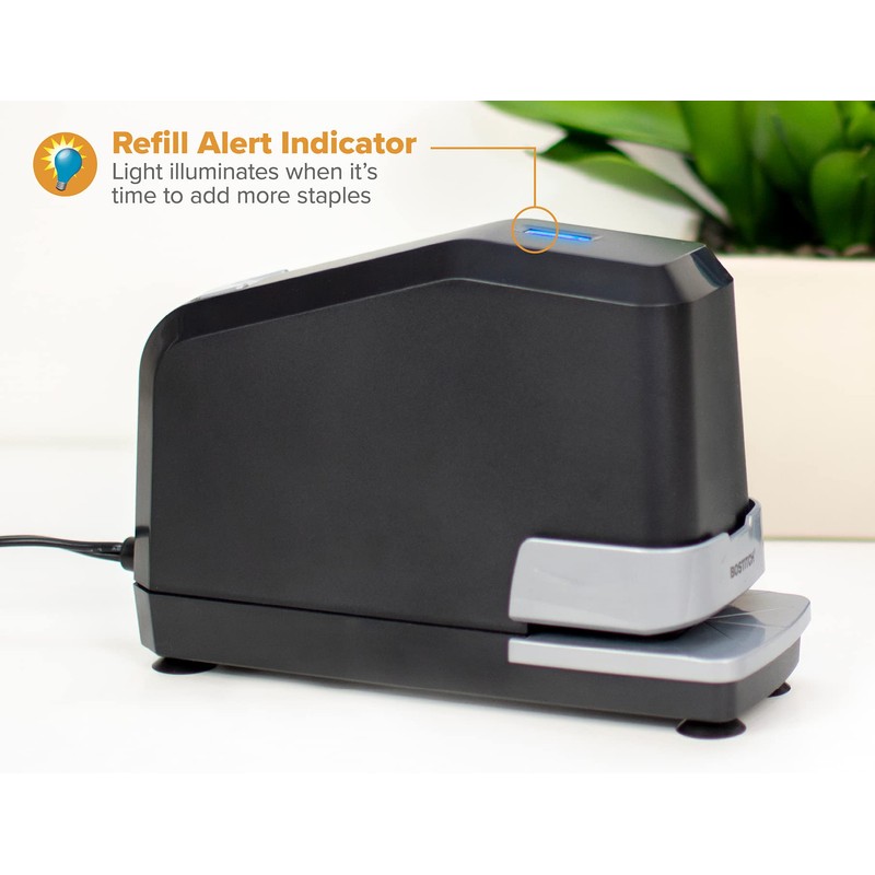 An electric stapler designed for fast, reliable performance. Impulse drive technology staples in just a fraction of a second, while No-Jam technology prevents staple jams for smooth, Rapid stapling. Refill alert light indicates when staples need to be reloaded, and push-button fast load system makes staple refill quick and easy. Convenient staple storage compartment keeps extra staples in the unit for immediate refill.