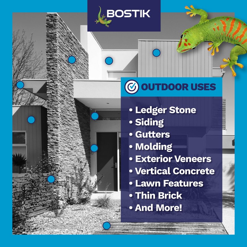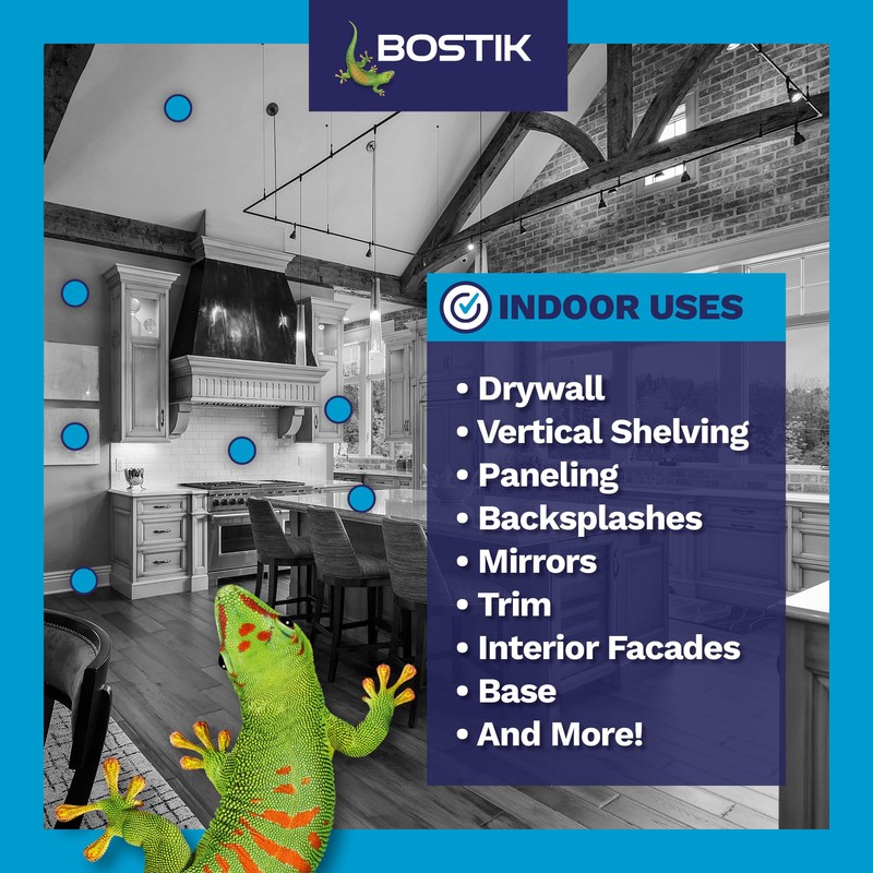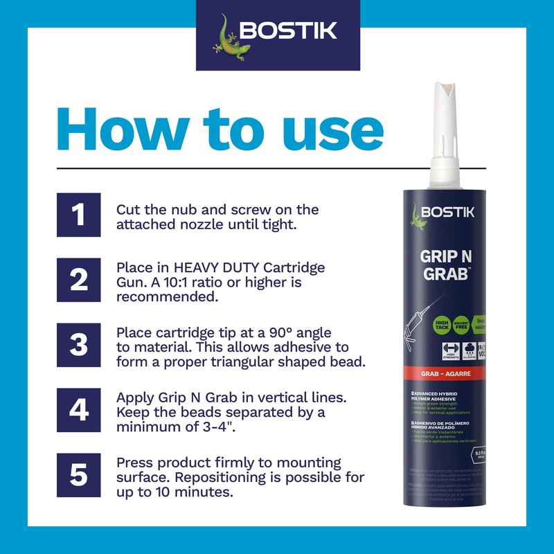 Bostik’s Grip N Grab is an instant grab adhesive, based on advanced hybrid polymer technology, specifically designed to decrease installation time of vertical applications. Grip N Grab high initial bond strength provides the ability to grab heavy materials quickly without slippage, eliminating the need for secondary mechanical support on majority of applications. Grip N Grab cures under the influence of humidity to form a durable elastic rubber, that bonds to most building materials in a variety of applications. This 100% waterproof, low odor formula is designed for both interior and exterior projects. Grip N Grab is solvent free, has a quick cure time, and can even be used on damp or wet surfaces.
