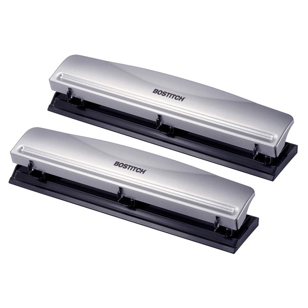 Bostitch Office 3 Hole Punch, 12 Sheet Capacity, Metal, Silver, 2-Pack