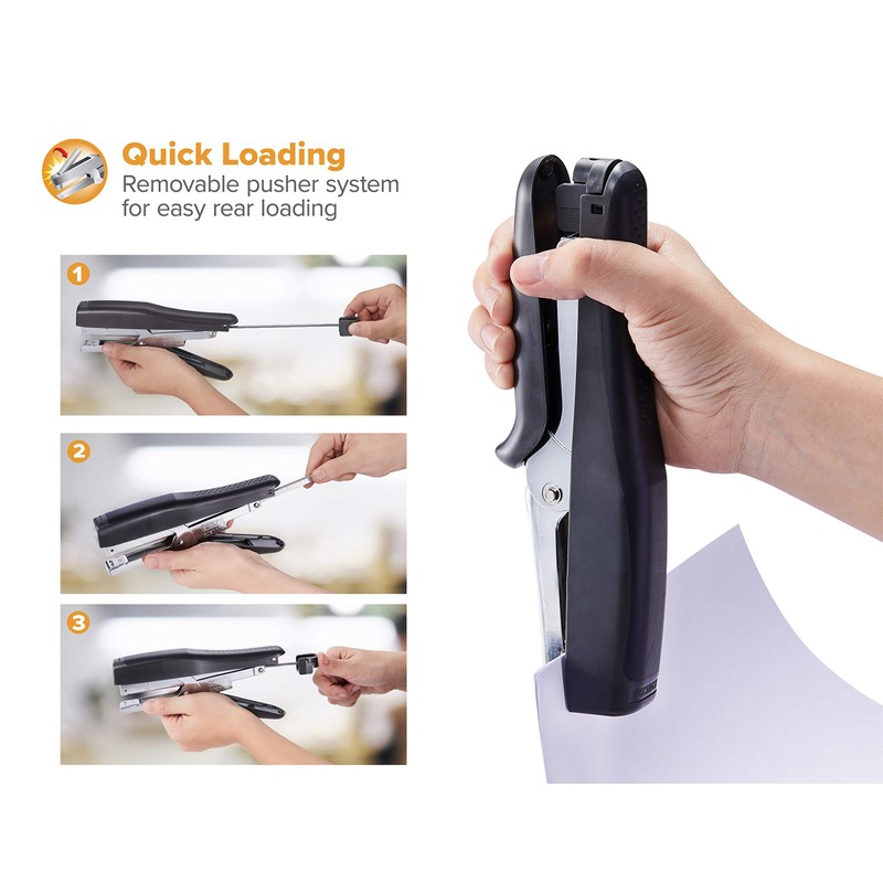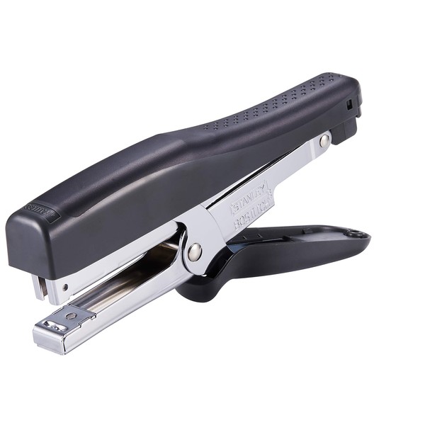 - Black in color with metal and composite construction for quality and durability. With Soft rubber handle for stapling comfort