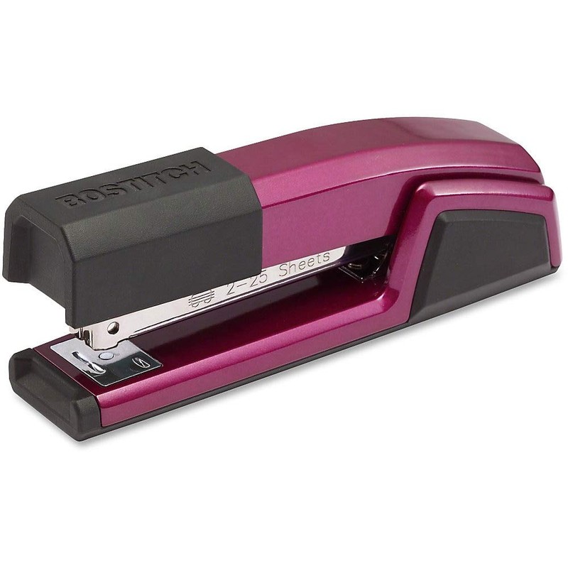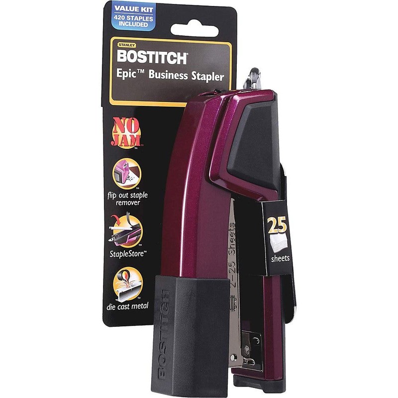Epic Stapler offers ultimate durability and efficiency in a premium, classic design. Die-cast metal construction ensures long-lasting performance while soft rubber grip and base provide comfort during use. protected, full-strip stapler delivers efficiency with a swing-out staple EZ Remover and a hidden StapleStore compartment on the bottom of the unit to keep two staple strips on hand. Accenting any desk, it stands vertically or horizontally for easy access and storage. This stapler opens 180 degrees for bulletin board tacking or crafting. It staples up to 25 sheets at a time. Full-strip staple capacity holds one strip of 210 standard staples.