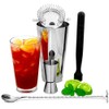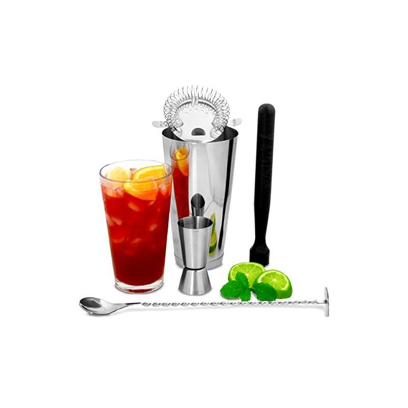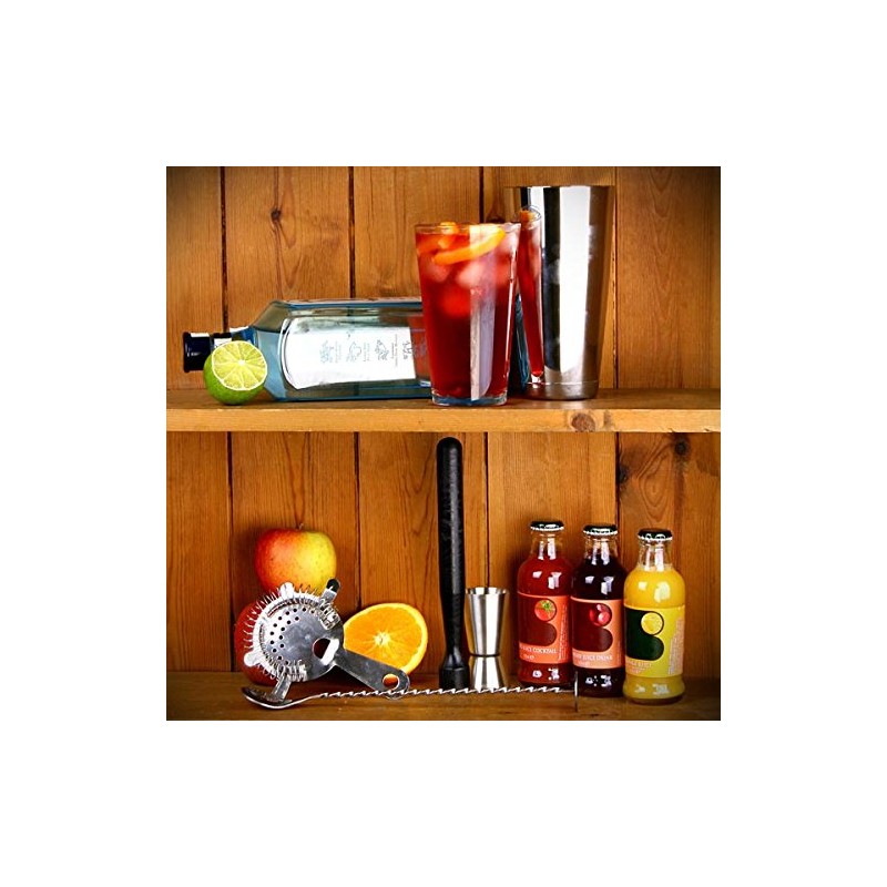 - Set contains: Professional Boston Cocktail Shaker, Double Jigger Measure, Black Cocktail Muddler, Twisted Mixing Spoon and a Hawthorne Cocktail Strainer