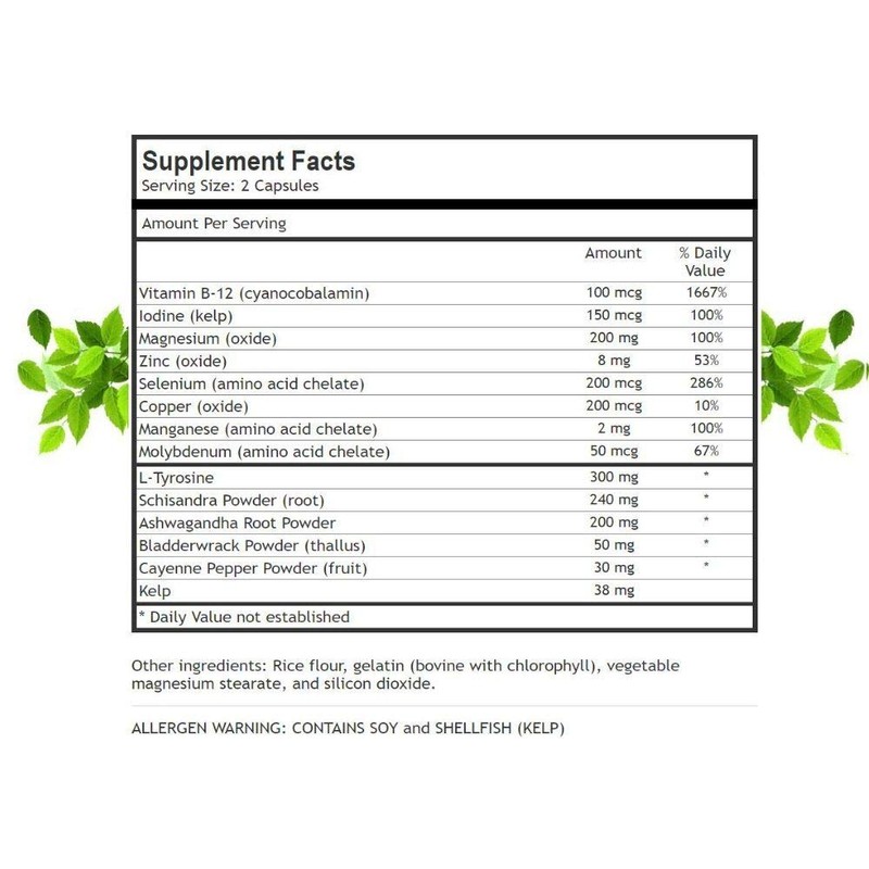 - PREMIUM ALL-NATURAL BLEND of vitamins, herbs, minerals, herbs and amino acids designed by experts in the field of modern nutritional science. These natural ingredients include: vitamin b-12, iodine, magnesium, zinc, selenium, copper, manganese, molybdenum, l-tyrosine, schizandra, ashwagandha root, bladderwrack, & cayenne pepper. This formula is effective for both women and men!