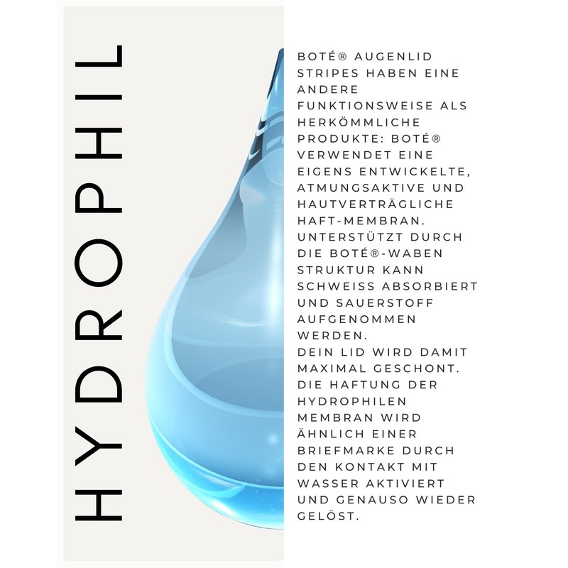 - Effective and comfortable – our groundbreaking boté mesh technology ensures 24-hour safety and gentle wearing comfort of our eyelid stickers against slip-on eyelids thanks to the form-fitting honeycomb structure