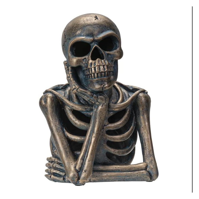 • UNIQUE DESIGN - This skeleton is a great listener – the thoughtful pose, bronze finish, and backlit rib cage makes this a must-have skeleton for the collectors of unique skeleton designs.