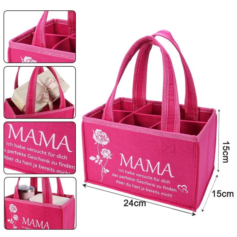 Bottle Bag for Mum - Felt Bag for 6 Bottles, Gifts for Women, Gift, Shopping Bag with Carry Straps and Print, for Wife, Girlfriend, Sister (24 x 15 x 15 cm), pink
