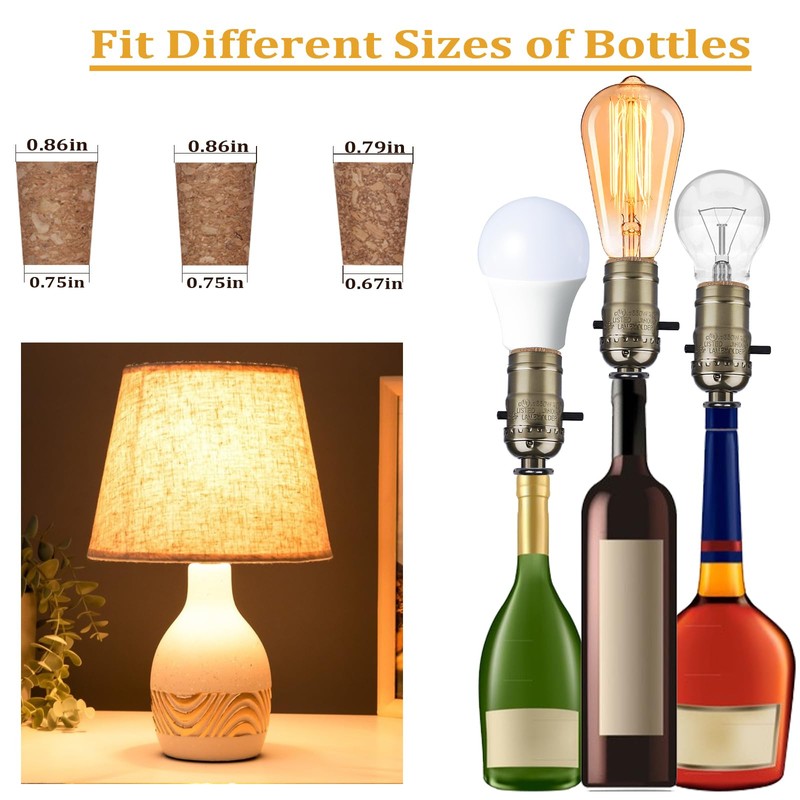 - WORKS WITH ALL BOTTLES:The rewire lamp kit is compatible with most glass bottles, including wine, whiskey, vodka, beer, and soda. The kit contains three different sizes of tapered corks, so you can choose the one that fits well with your bottle
