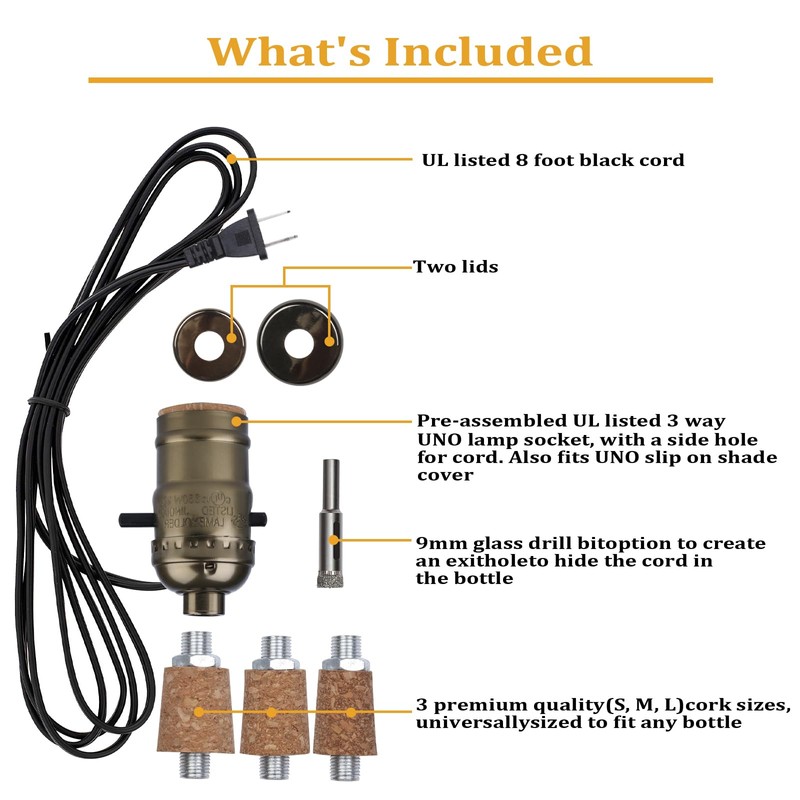 - COMPLETE BOTTLE LAMP KIT: The lamp kit for liquor bottle includes an 8ft cord socket, 9mm glass drill bit, fittings, and three sizes of corks (lamp shade not included). By following the instructions, you can easily DIY your own bottle lamp and transform any bottle into a meaningful keepsake lamp