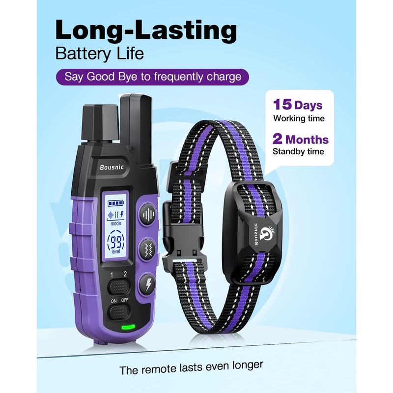 - Humane and Safe, Eliminate Bad Behavior Effectively: Bousnic Dog shock collar features 3 humane training modes with adjustable beep(1-8 levels), vibration(1-16 levels), safe shock(1-99 levels). It helps your unruly and hard-headed dogs learn to be a better part of your household.