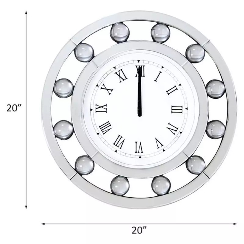 Time to shine with the mirrored wall clock. This clock features a circular floating crystal balls and beveled mirror frame. The clock face has a clean, modern look featuring roman numerals. Its casual yet elegant look will become the most stunning decoration of any place.