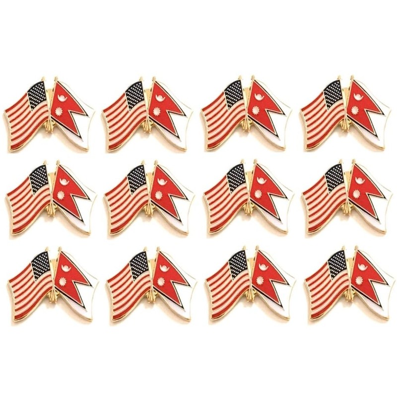 Box of 12 Nepal & US Crossed Double Flag Lapel Pins, Country Flag & American Flag Friendship Tie Pin Badges