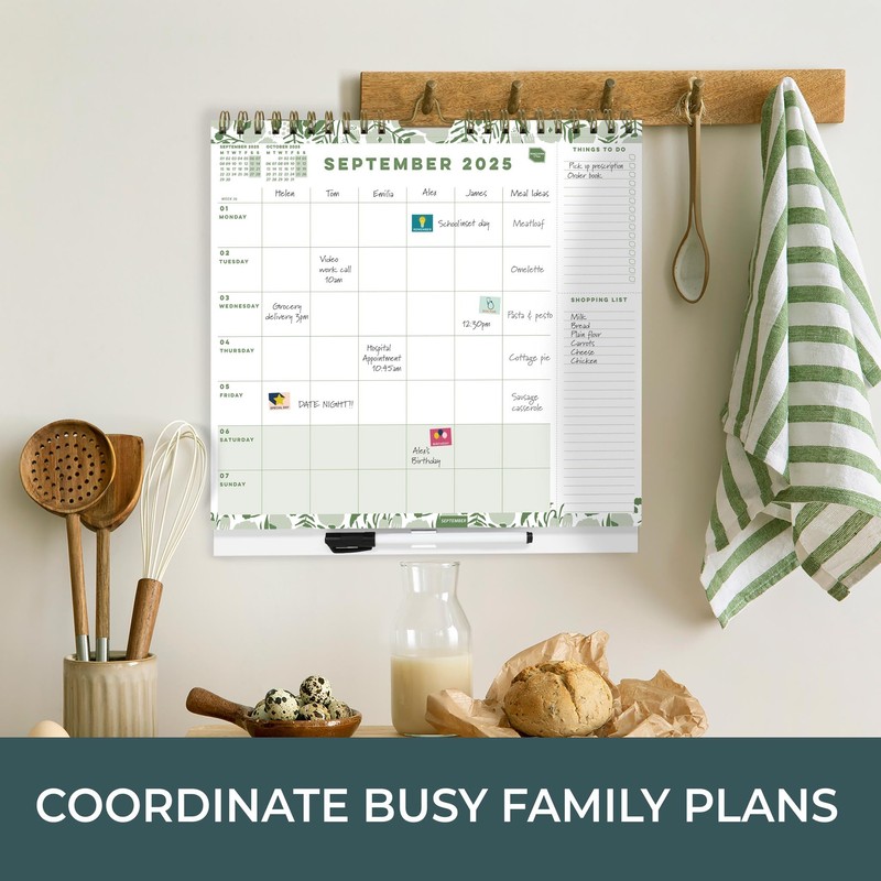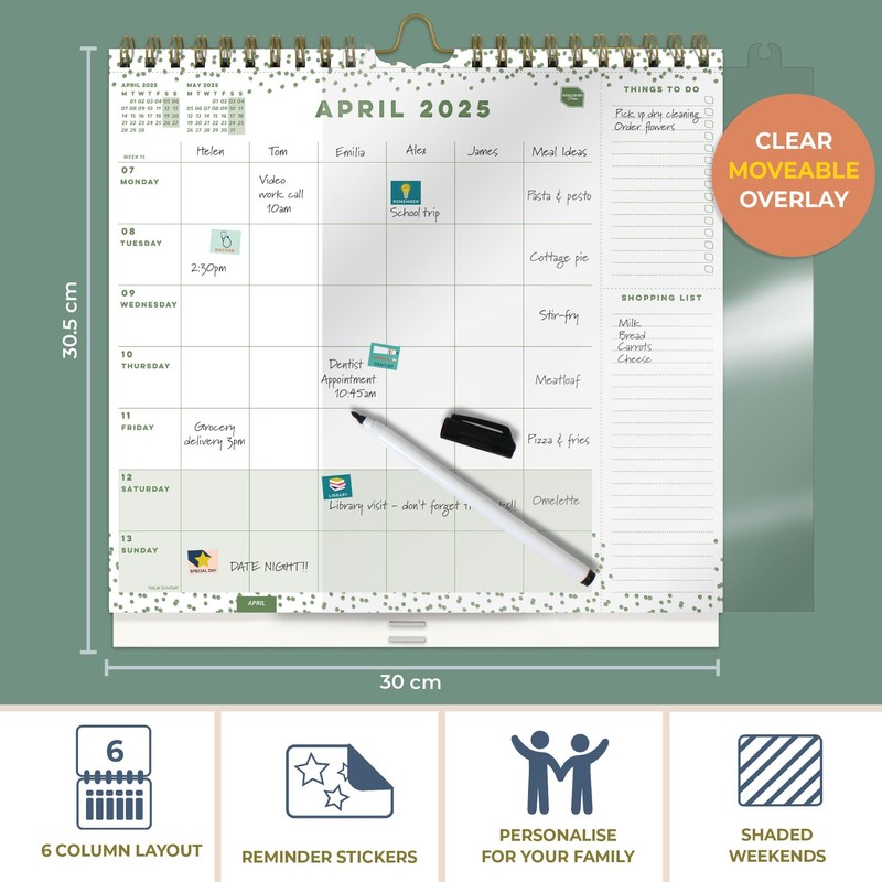 - Perfect for the whole family to see what events are coming up each week, this 2025 family calendar also has space for useful numbers and birthdays, a paperwork pocket & pen to write on the overlay.