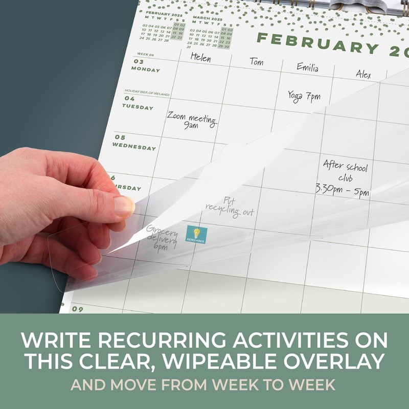 - Use the clear plastic overlay to write down recurring weekly activities and move from week to week to never forget your plans. Calendar 2025 wall with colourful stickers to highlight important dates.