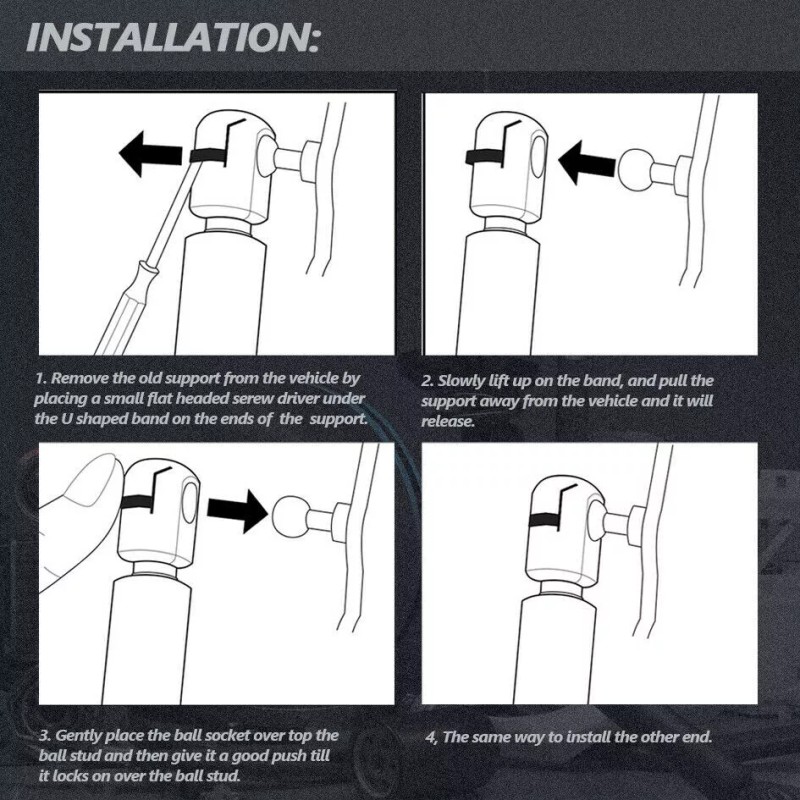- Placement of lift supports,struts,dampers could be front or rear hood, trunk, tailgate,liftgate, trunk lid, hatch,rear window glass,tailgate assit,storage box and so on.
