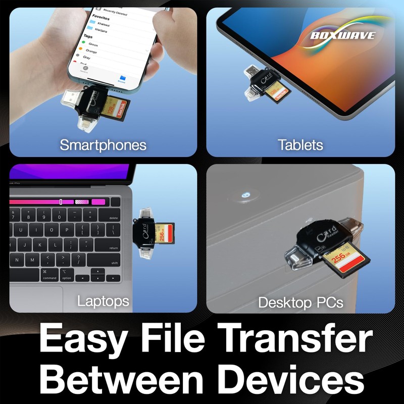 BoxWave's AllReader SD Card Reader is one of the most VERSATILE SD and microSD card readers for your device! Comes with four interfaces including USB-C, USB-A and Micro-USB for easy access.