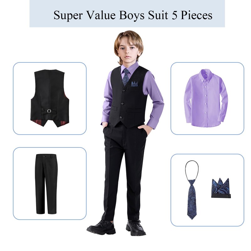 - Premium Material: Crafted with high-quality materials, this boy suit is designed to be durable and stylish, ensuring long-lasting wear and a sharp look. Package Include: Dress Shirt*1 + Dress Vest*1 + Dress Pants*1 + Tie*1+Pocket Squareo*1.