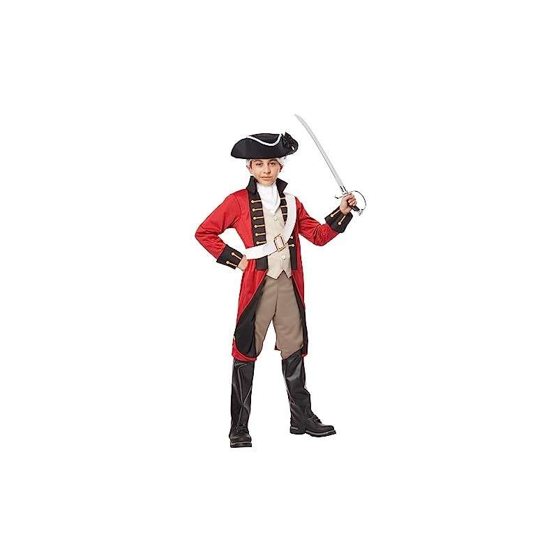 An 18th century British style army uniform. This child Redcoat costume includes jacket with attached vest, cravat, chest belt, and boot tops. Shoes and sword not included. Hat and wig sold separately.