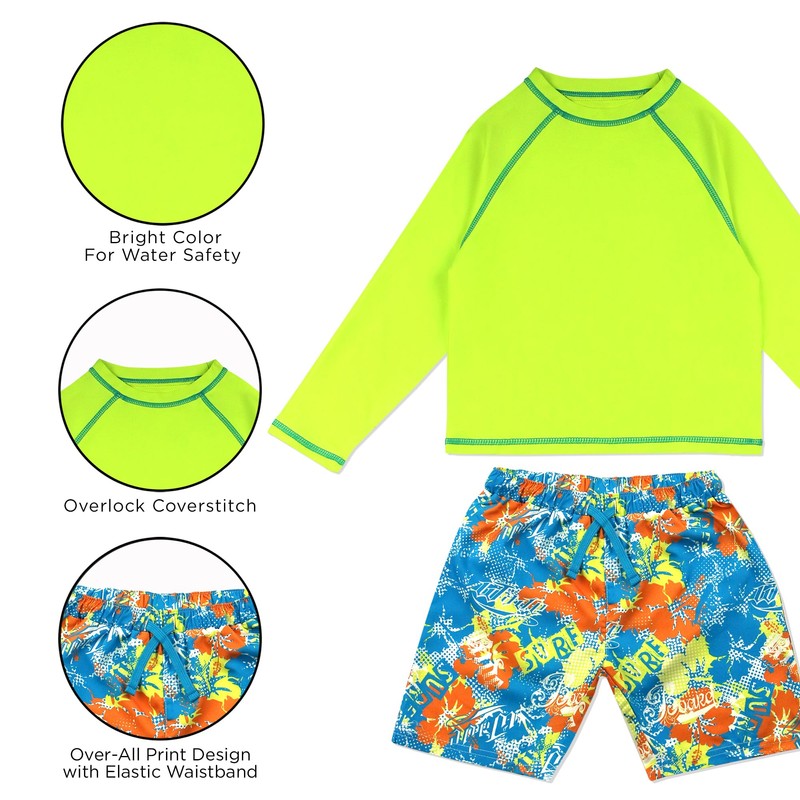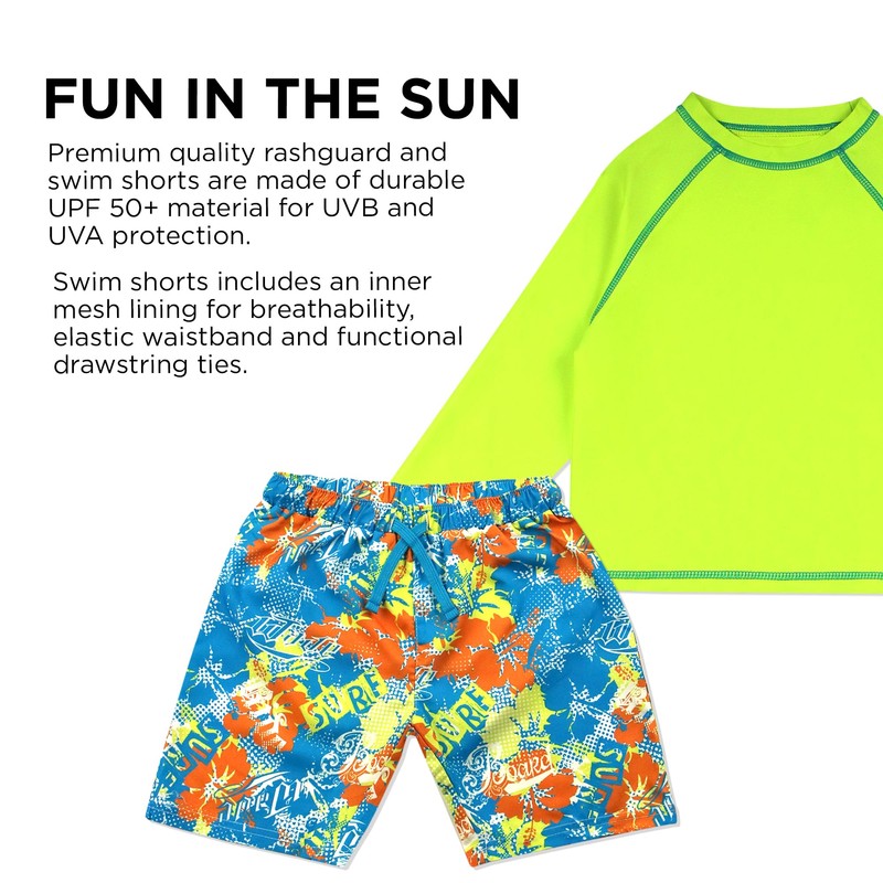 Boys Swim Set with Long Sleeve Rash Guard, Swim Shorts (Neon Yellow, Size 7-8 Years)