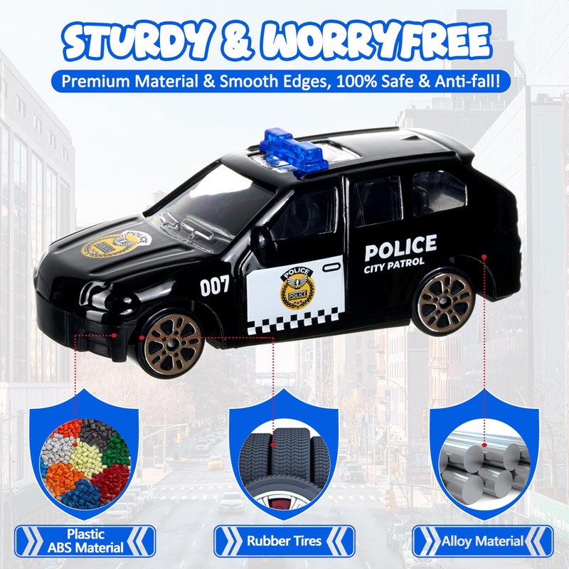 - 【DURABLE METAL DIECAST TOY】Police car toy are made of high quality ABS eco-friendly plastic and zinc alloy that are Safe, durable metal diecast toy that are fall-resisting, crash-resisting, Safe for kids. And Police car toys pass the US toy standard CPSIA & ASTM test . Police car can be used in boy birthday party supplies who like Police toy. Your kids will enjoy the time with their playset and friends.