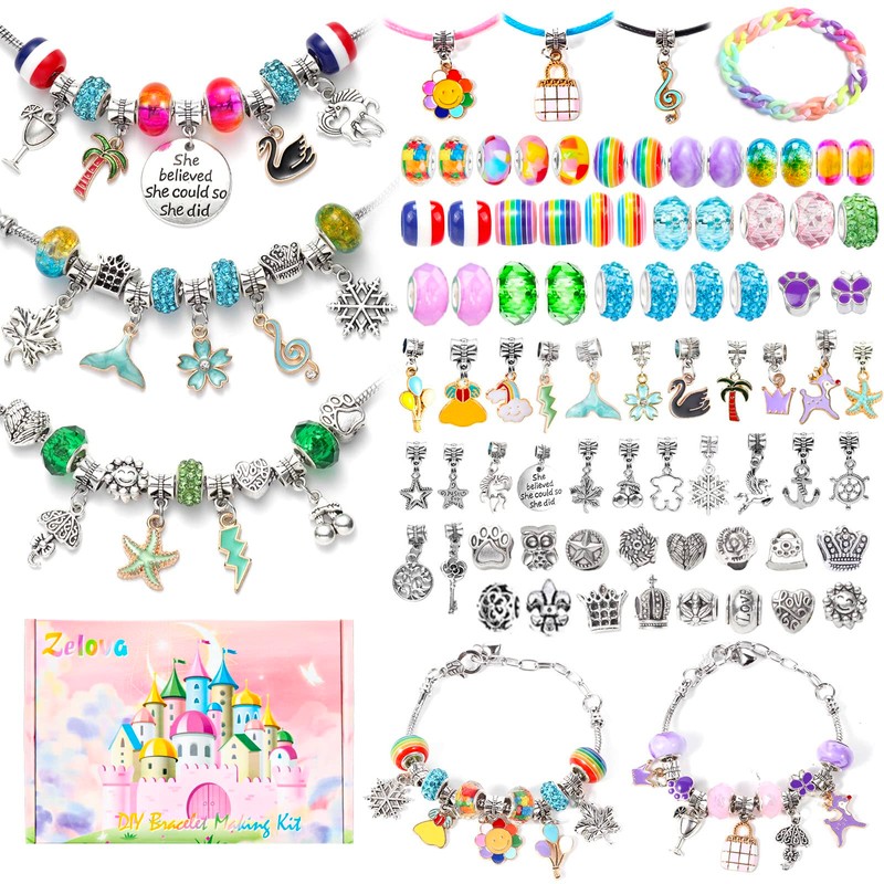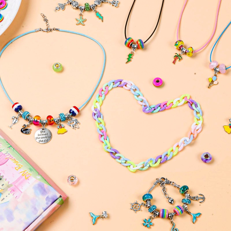 • ✔ FAIRYTALE ROMANTIC JEWELRY: The handmade charm bracelet kit is equipped with a pretty pink box, 34 colorful beads, 16 metal spacer beads, 30 pendants, 5 bracelets, 3 waxed necklaces and 50pcs colorful acrylic linking rings.They are easy to put on and remove, children can use their imagination to make their favorite bracelets or necklaces.