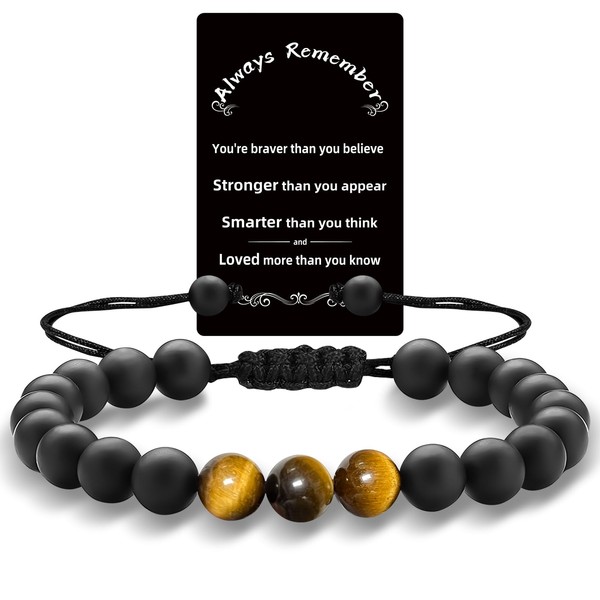 - 【Cool Bracelet + Wallet Card】:This men's bracelet is handcrafted with high-quality natural Tiger Eye and Black Agate stones. It brings strength, courage, and good luck to your son, grandson, brother, or lover while dispelling negative energy. The black stainless steel wallet card serves as a constant reminder of your love.