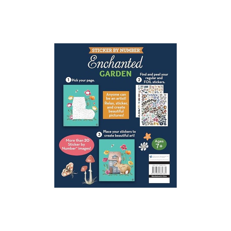 Step into the magical world of Sticker by Number: Enchanted Garden. Features 24 colorful and whimsical images to sticker, including magical settings with birds, fairy houses, flowers, butterflies, and other cute animals. Puzzle designs range in difficulty. First, sticker an image with the standard sticker sheet, then complete the image with the special foil stickers located in the back of the book. Includes 18 regular sticker sheets and 2 foil sticker sheets to add extra shine to the final images! Perforated pages allow you to take your creation out of the book and hang it on the wall. Made for adults, but kids and teens can enjoy as well!Similar to color or paint by number, this sticker activity book features designs that are divided into spaces, each with a number that corresponds to a sticker. Find the sticker, peel it, and place it in the right space. Watch as a full colored image emerges from the original unfinished illustration.