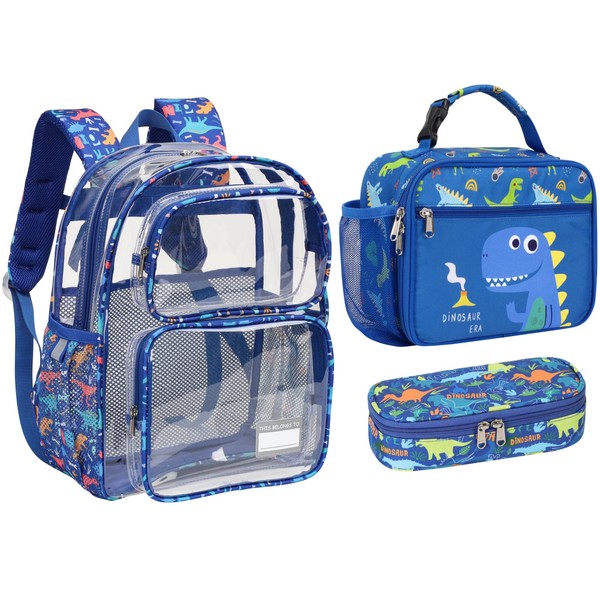 BrainyBees Clear Backpack for Boys 3 in 1 Set – 15 Inch Transparent Bookbag with Clear Lunch Bag & Pencil Case, Blue Dinosaur